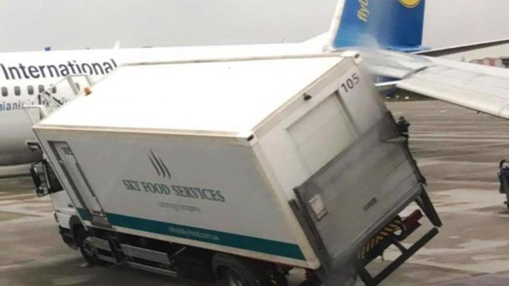 Сегодня утром в киевском аэропорту «Борисполь» самолет авиакомпании Международные авиалинии Украины при рулении зацепил крылом автомобиль кейтеринговой компании Sky Food Service.