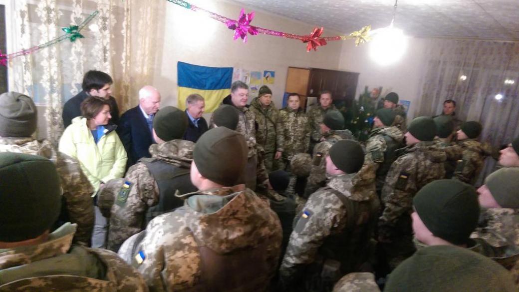 Пресс-секретарь президента Святослав Цеголко отметил: «Президент с американскими сенаторами прибыл на командный пункт в районе Широкино, чтобы поздравить наших воинов с новым годом».