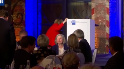 Канцлер Германии Ангела Меркель, поднимаясь на трибуну, чтобы выступить перед представителями торговли и промышленности в Берлине споткнулась и упала.