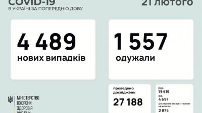 В Украине за минувшие сутки, 20 февраля 2021, зафиксировано 4 489 новых случаев случаев заражения COVID-19. Выздоровели 1557 человек, зарегистрировано 58 летальных случаев.