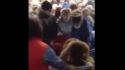 В супермакете толпа россиян пытаются перехватить друг у друга заветные пакеты.