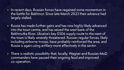 Это подтверждает восстановившаяся в последние дни определенная динамика в боях за Бахмут, хотя с конца марта 2023 года их продвижение в значительной мере остановилось.