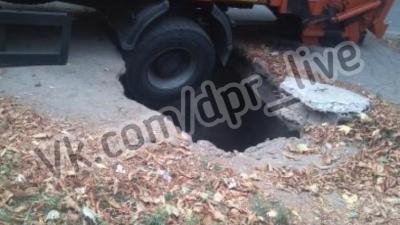 В Калининском районе неподконтрольного Украине Донецка мусоровоз провалился под асфальт. Об этом сообщают очевидцы в социальных сетях.