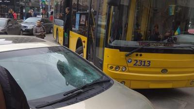 В центре Киева пассажиры троллейбуса разбили авто, блокирующее проезд