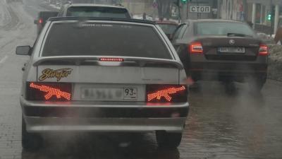 Это автомобиль с российскими номерами — авто прибыло из Краснодарского края. Его стоп-сигналы имеют форму автоматов.
