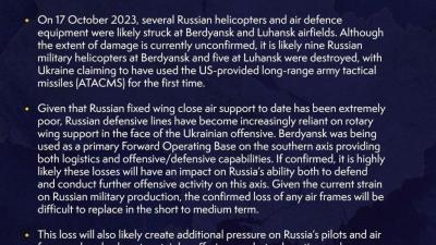 Британская разведка оценила последствия украинского удара дальнобойными ракетами ATACMS по российским вертолетам во временно оккупированных Бердянске и Луганске.
