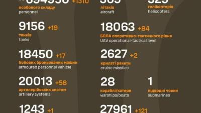 За минувшие сутки ВСУ ликвидировали 1310 оккупантов и уничтожили более 300 единиц вражеской техники.