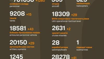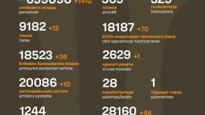 За прошедшие сутки Силы обороны Украины уничтожили 1410 оккупантов и более 150 единиц различной техники.