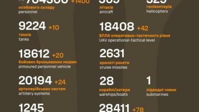 За минувшие сутки Силы обороны ликвидировали 1400 оккупантов и более 180 единиц вражеской техники.