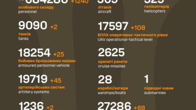 За прошедшие сутки Силы обороны Украины ликвидировали 1240 оккупантов и уничтожили более 250 единиц техники.