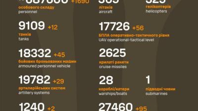 За прошедшие сутки Силы обороны ликвидировали 1690 захватчиков и более 240 единиц техники врага.