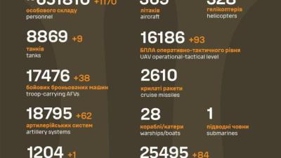 За минувшие сутки украинские защитники ликвидировали 1170 оккупантов и почти 300 единиц техники.