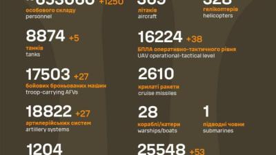 Общие боевые потери противника с 24 февраля 2022 года ориентировочно составили: