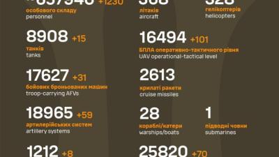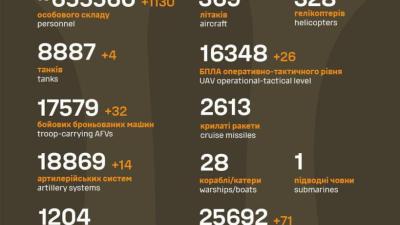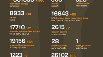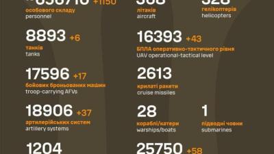 За прошедшие сутки украинские защитники ликвидировали 1 130 оккупантов и десятки единиц вражеской техники.