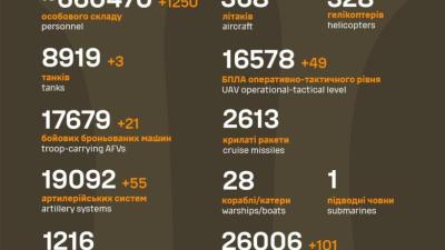 За минувшие сутки украинские защитники и защитницы ликвидировали 1250 российских захватчиков и уничтожили более 160 единиц вражеской техники.