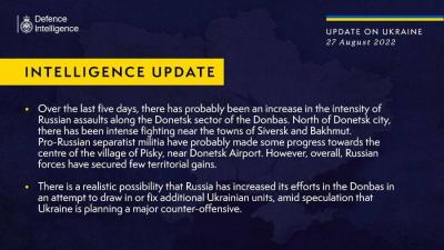 Карта боевых действий в Украине на 31 августа от британской разведки: ВСУ пытаются прорвать оборону россиян на трех направлениях