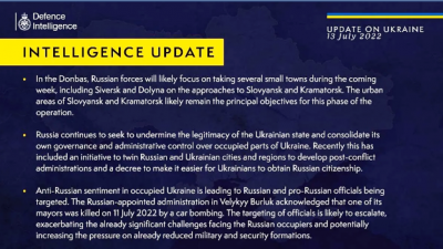 Российская армия на Донбассе продолжает штурмовать позиции украинских военных и населенные пункты, однако, ВСУ сдерживают атаки россиян. Об этом сообщает Министерство обороны Великобритании, публикуя актуальную карту боевых действий в Украине по состоянию на 13 июля.