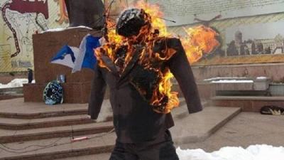 Чучело президента Украины Петра Порошенко во время мероприятий, которое проходило на Центральной площади в Черновцах, сожгли активисты
