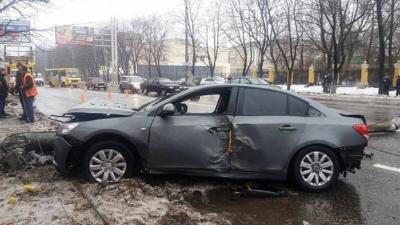 Сегодня днем в центре оккупированного Донецка легковой автомобиль врезался в железобетонный столб.