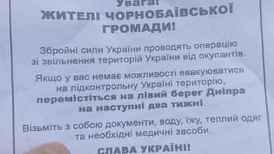 В захваченном войсками РФ Херсоне местные партизаны просят жителей населенных пунктов Правдино, Солдатское, Петровка, Барвинок, Новокиевка, Шмидтово, Крутый Яр, Киселевка, Надеждовка, Парышивое, Грозовое, Знаменка, Зорянка, Томина Балка, Красный Подол срочно эвакуироваться на левый берег Днепра.