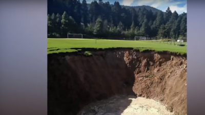 В Мехико в районе Куахимальпа почти половина футбольного поля внезапно ушла под землю. К счастью это произошло не во время игры и в момент неожиданного провала почвы на футбольном поле никого не было.
