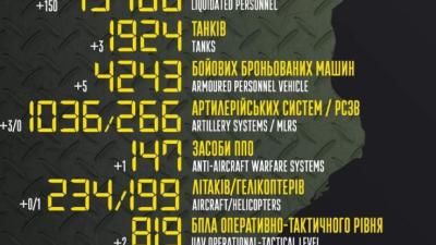 Россия за сутки потеряла 3 вертолета, около 10 беспилотников и 150 военных. Новые данные от Генштаба