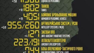 С начала полномасштабного вторжения России в Украину потери российских захватчиков достигли около 41 900 человек, 1802 танков и сотен единиц военной техники. Об этом сообщили в Генштабе ВСУ.