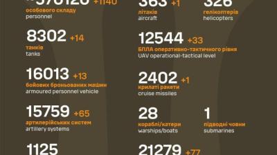 Согласно последним данным, ВСУ за сутки ликвидировали 1140 российских оккупантов, 1 ПВО, 1 самолет и десятки единиц вражеской техники.