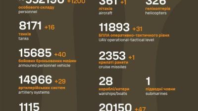 За прошедшие сутки оккупанты потеряли 1200 единиц личного состава, 1 самолет, 1 ПВО и другую технику.