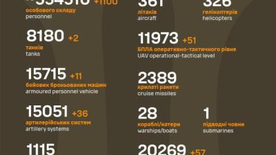 Генштаб информирует, что за сутки враг потерял 1100 бойцов, 3 средства ПВО, 50 БПЛА и другую технику.