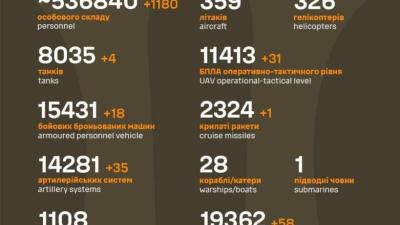 В течение суток украинские защитники ликвидировали 1 280 оккупантов и более 180 единиц техники.