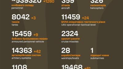 Потери россии за сутки: 1260 оккупантов, уничтожено 42 артиллерийские системы, 9 боевых бронемашин и много другой техники.