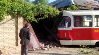 Вагон влетел в забор жилого дома, который находился в нескольких метрах от трамвайных путей.