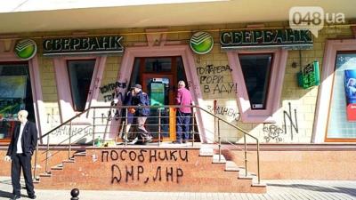 Здание Сбербанка России, расположенное в центре Одессе облили краской и расписали надписями.