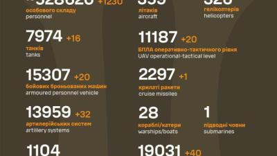 За минувшие сутки ликвидировано еще 1230 захватчиков, 32 артиллерийские системы и 16 танков. Об этом сообщает Генштаб ВСУ.