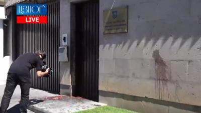 В Ереване участники молодежного союза «Дащнакцутюн» в знак протеста против заявления украинского МИД относительно ситуации на армяно-азербайджанской границе, облили борщом здание посольства Украины.