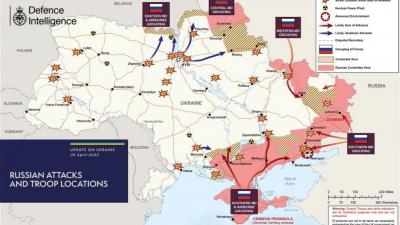 Минобороны Великобритании показало актуальную карту боевых действий в Украине по состоянию на 22 апреля.