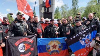 Местный активист отметил: «Один из „Ночных волков“ напал на нашу коллегу, женщину, которая держит украинский флаг, и так ей сжал руку, что у нее синяки на руке».
