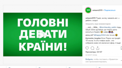 Кандидат в президенты Украины и украинский комик Владимир Зеленский намерен провести дебаты с действующим главой государства Петром Порошенко 19 апреля на НСК «Олимпийский». Об этом сообщается в социальных сетях на страницах «Команды Зеленского».