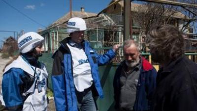 Сотрудники миссии ОБСЕ, прибывшие на место обстрела жилого сектора Донецка, фиксируют разрушения и собирают осколки.