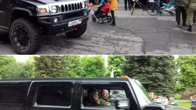 На снимке показаны главари «ДНР», прибывшие на парад на черных джипах. В комментарии к фото блогер пишет:
