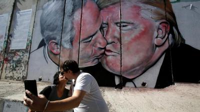 Граффити, изображающие поцелуй президента США Дональда Трампа с премьер-министром Израиля Беньямином Нетаньяху появилось на стене, отделяющей израильские территории от палестинских. Об этом сообщает агентство Reuters.
