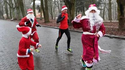 В зоопарке китайского города Харбин по случаю рождественских праздников пингвинов нарядили Санта-Клаусами.