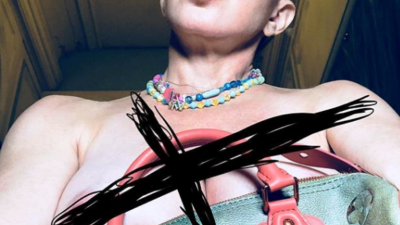 Так, на данном снимке она снята топлес, при этом она прикрывает грудь сумкой Louis Vuitton. На сумке изображена Мона Лиза Леонардо да Винчи.