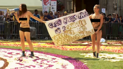 Две активистки движения Femen во время фестиваля «Ковер из цветов» в столице Бельгии Брюсселе провели очередную «голую» акцию.