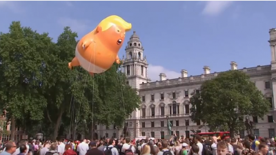 В Великобритании активисты, протестующие против визита президента США Дональда Трампа, запустили в воздух гигантский надувной шар в форме американского лидера в образе младенца в подгузнике и со смартфоном в руке.