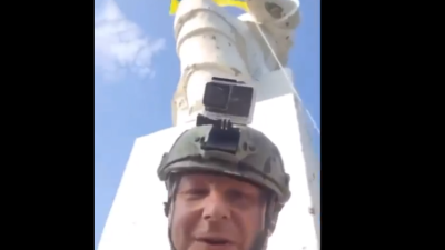 В частично захваченном войсками РФ Святогорске Донецкой области на самой высокой точке города — памятнике Артему, украинские бойцы установили флаг Украины.