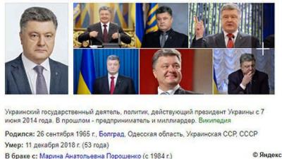 Российская поисковая система «Яндекс» сегодня неожиданно «похоронила» президента Украины Петра Порошенко. Так, Википедии поисковика сказано, что глава Украины умер 11 декабря в возрасте 53 лет.