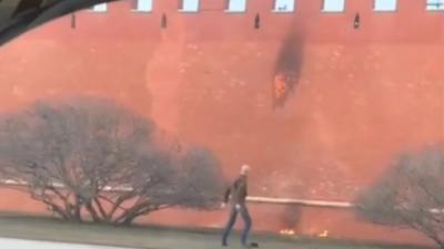В Москве мужчина забросал стены Кремля «коктейлями Молотова». Зажигательная смесь попадала на кремлевскую стену и воспламенялась, оставляя следы от продуктов грения.