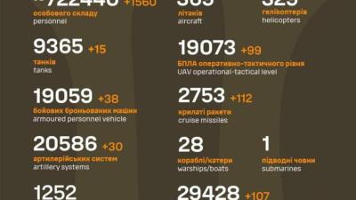 За минувшие сутки украинские Силы обороны ликвидировали 1560 оккупантов и уничтожили более 400 единиц техники и вооружения агрессора.